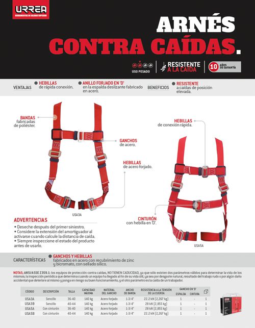 Arnés de seguridad contra caídas sencillo, talla 40-44 Urrea