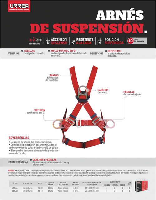 Arnés de seguridad de suspensión con cinturón, talla 40-44 Urrea