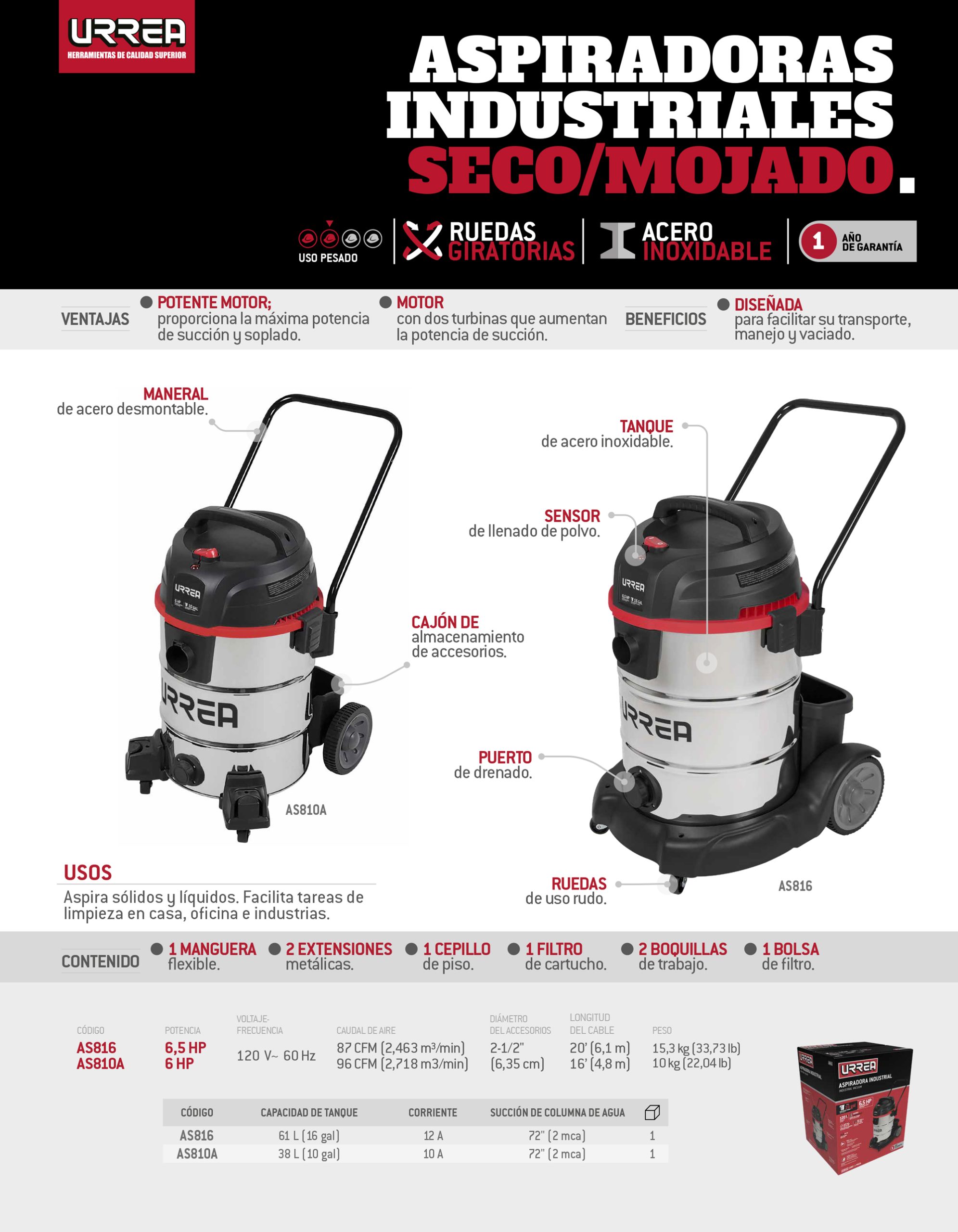 Aspiradora de acero inoxidable 10 galones, 6 HP Urrea