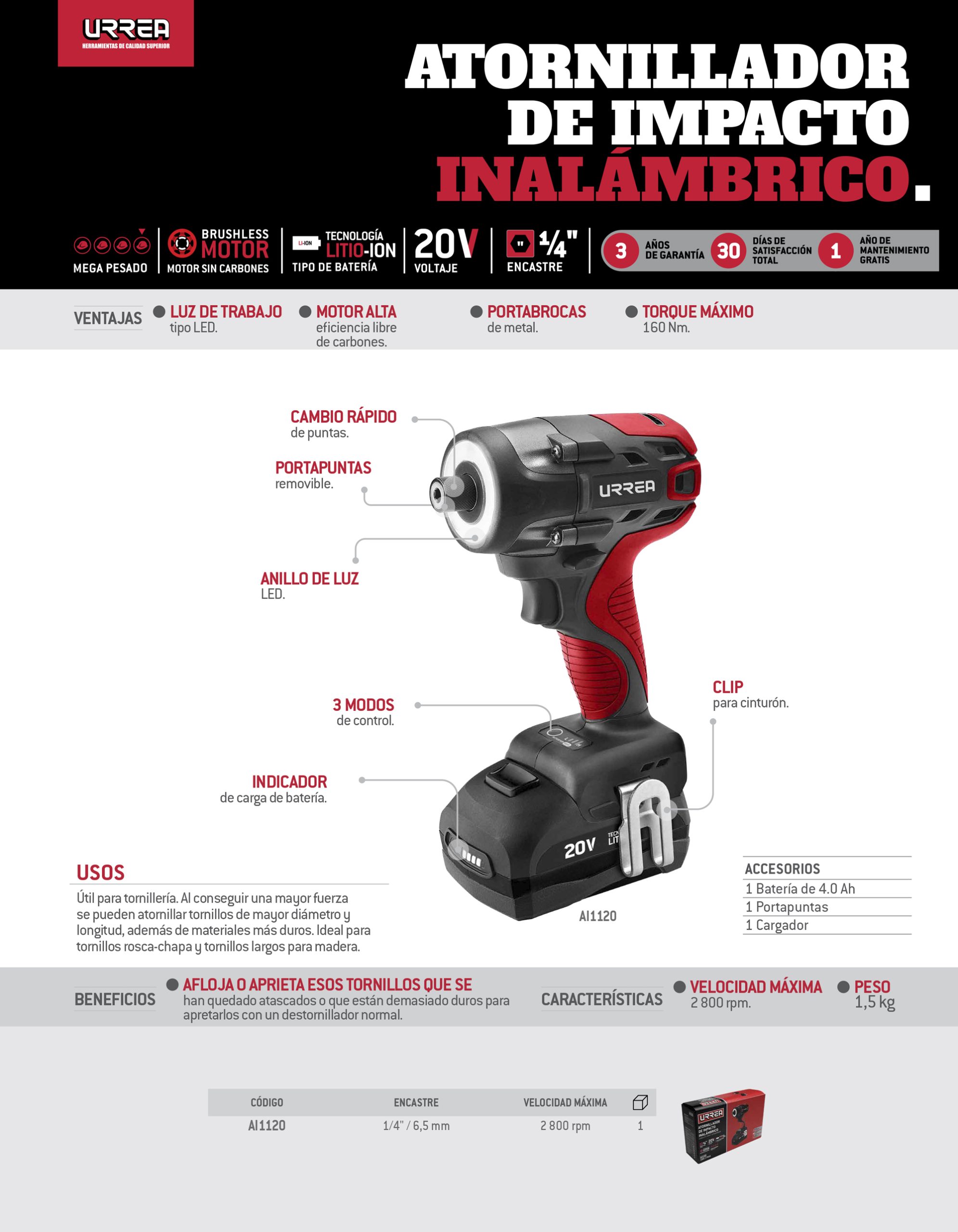 Atornillador de impacto 1/4″ a batería Litio-ion 20 V 160 Nm Urrea