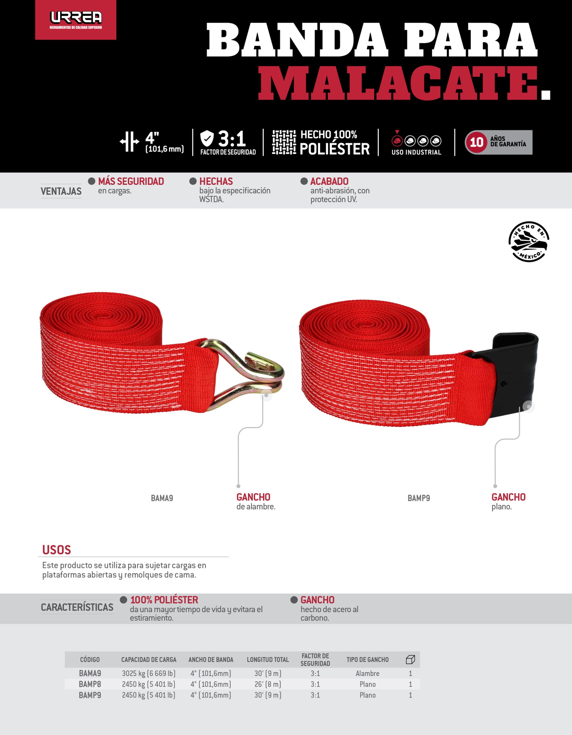 Banda para malacate con gancho de alambre 4″ x 9 m Urrea