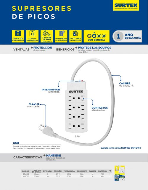 Barra multicontacto 8 entradas cable 60 cm Surtek