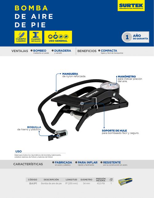 Bomba de aire de pedal con un cilindro con manómetro 9″ Surtek
