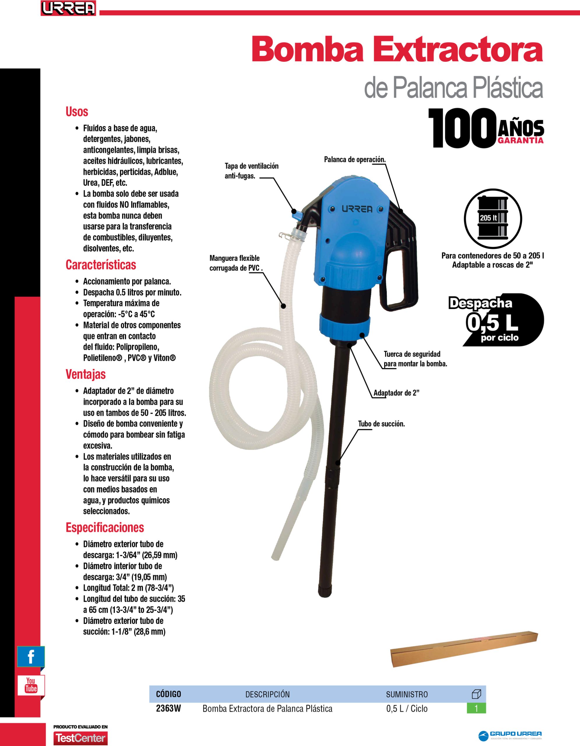 Bomba extractora de palanca plástica, suministro 500 ml por ciclo Urrea