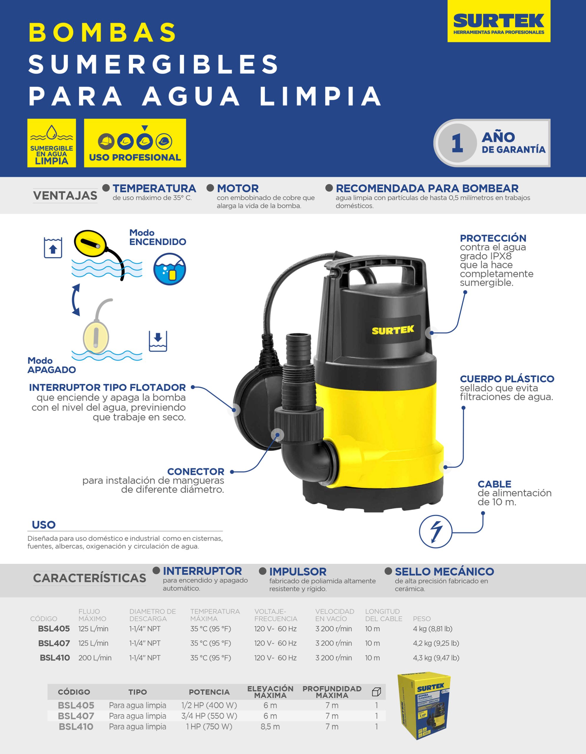 Bomba sumergible para agua limpia 3/4 HP 120 V Surtek