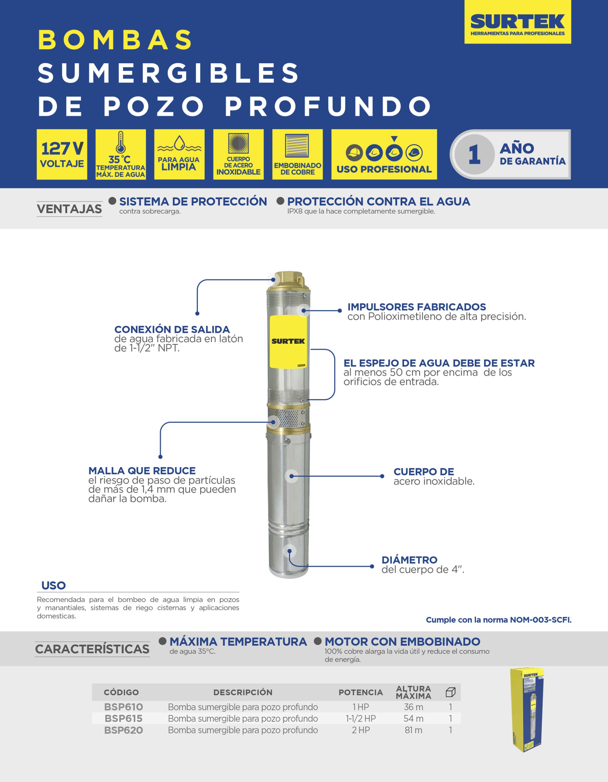 Bomba sumergible para pozos profundos 1-1/2 HP 127 V Surtek