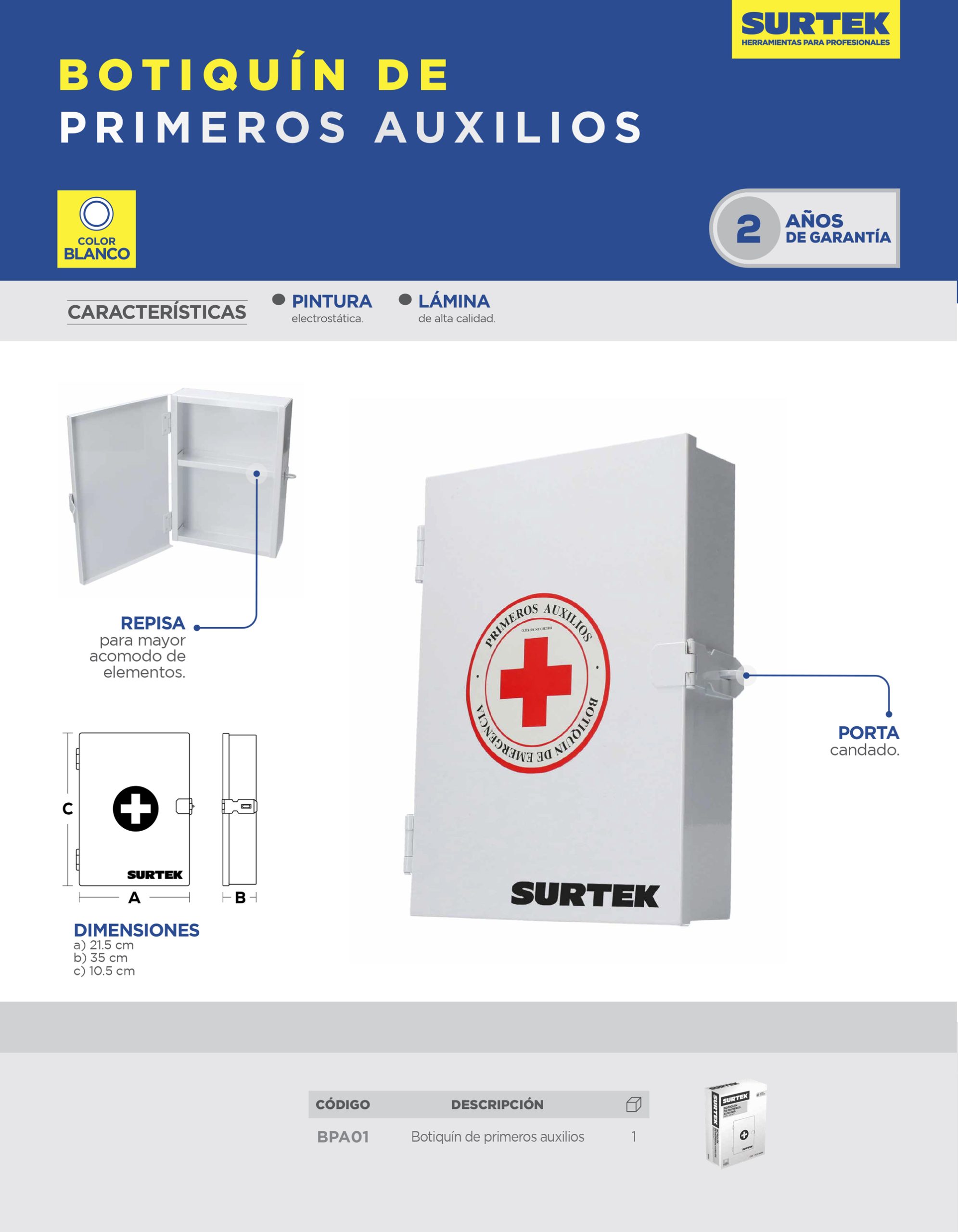 Botiquín de primeros auxilios de lámina con pintura electro estática Surtek