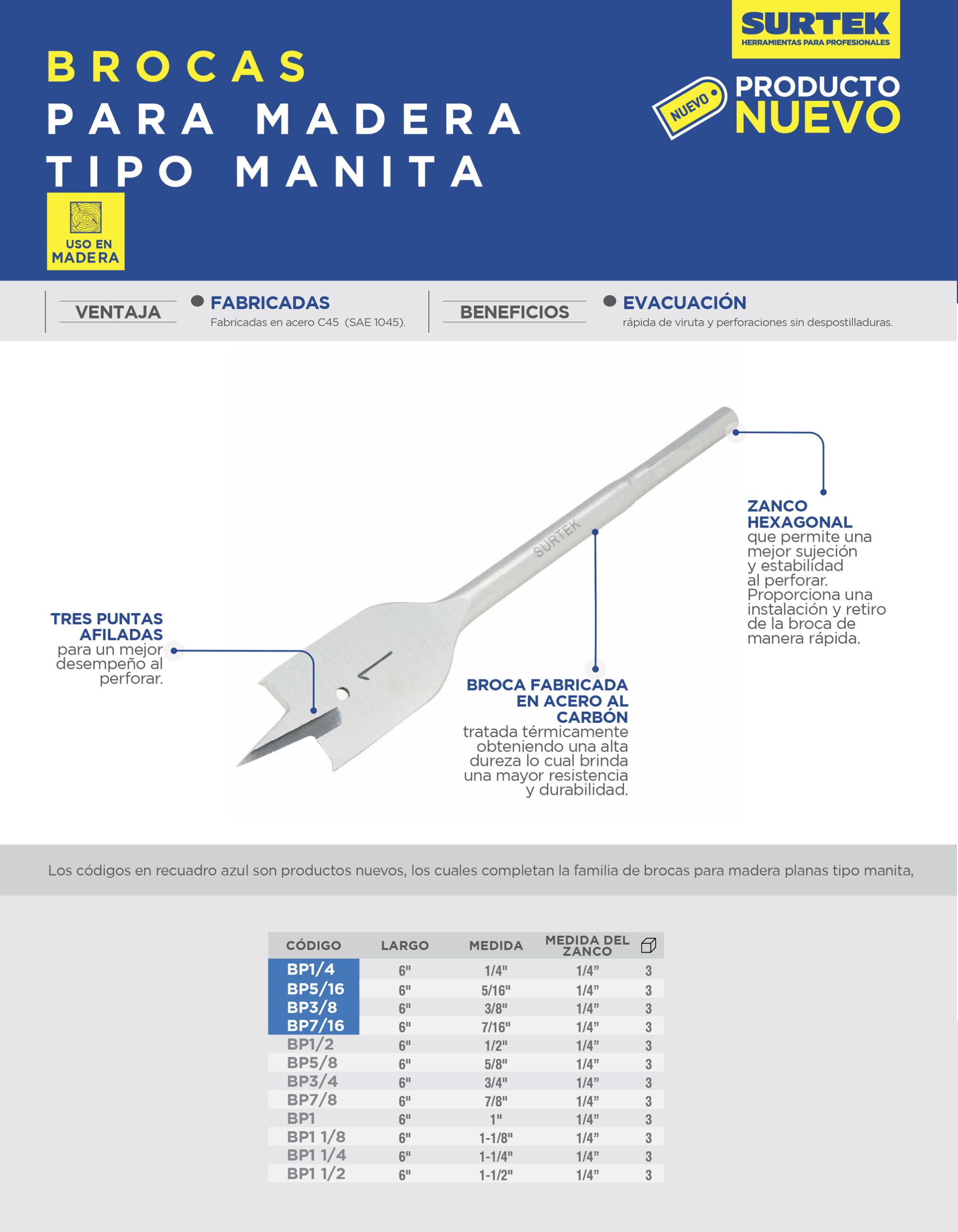 Broca para madera de acero al carbono tipo manita 5/16″ zanco de 1/4″ Surtek