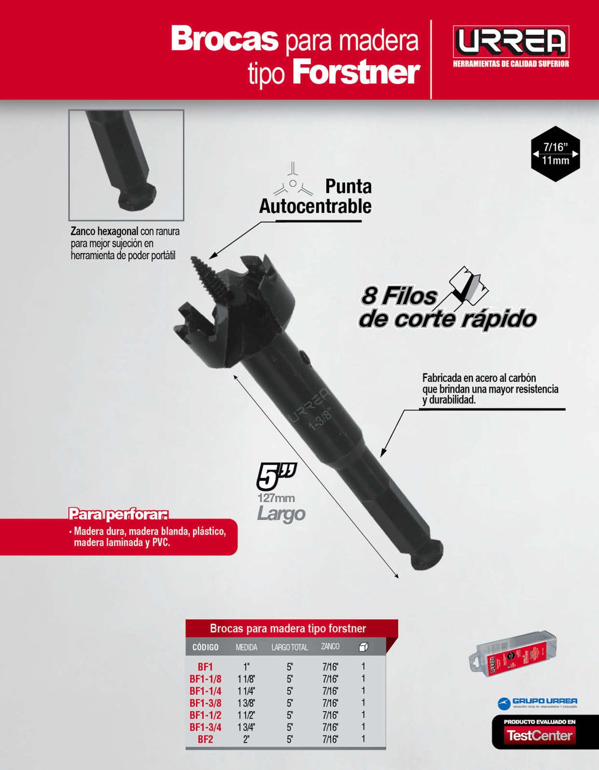 Broca para madera de acero forstner 1-1/8″ zanco de 7/16″ Urrea