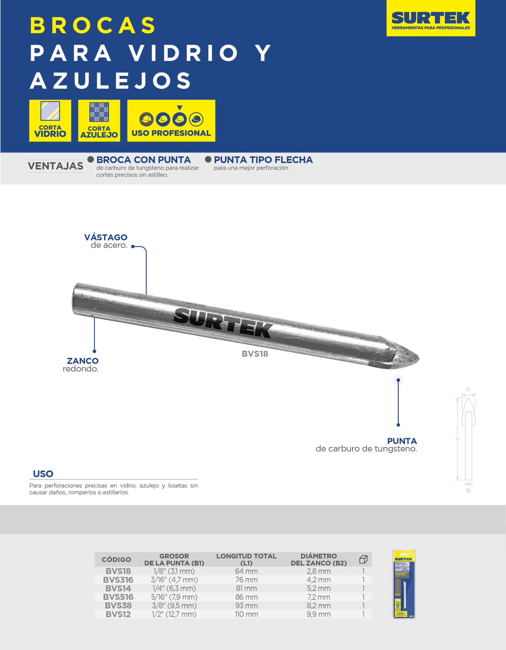 Broca para vidrios y azulejos de acero con cabeza de carburo de tungsteno 5/16″ Surtek