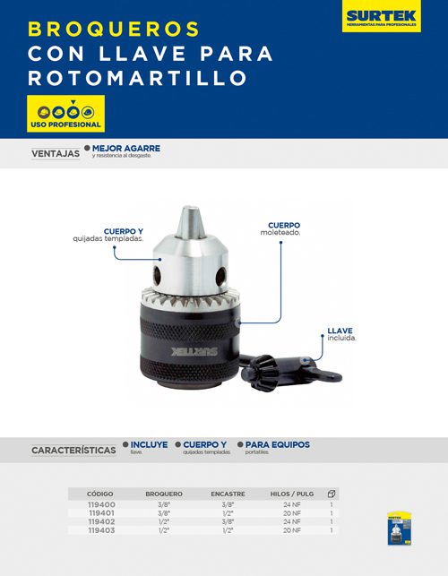 Broquero 1/2", rosca 3/8" - 24 NF con llave SurtekBroquero 1/2″, rosca 3/8″ – 24 NF con llave Surtek