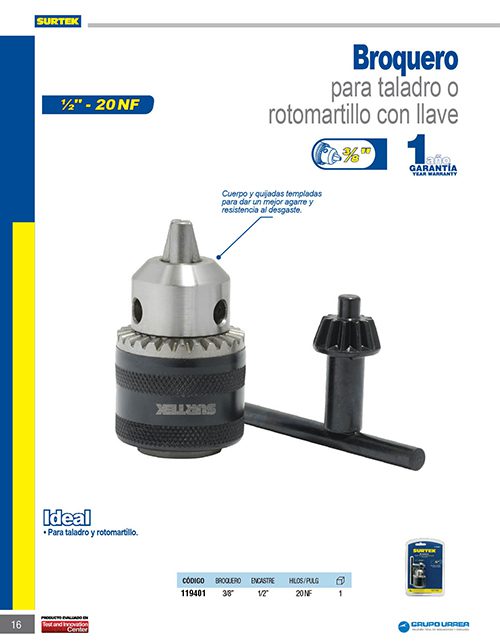Broquero para rotomartillos 3/8″ con rosca 1/2″ – 20NF con llave Surtek