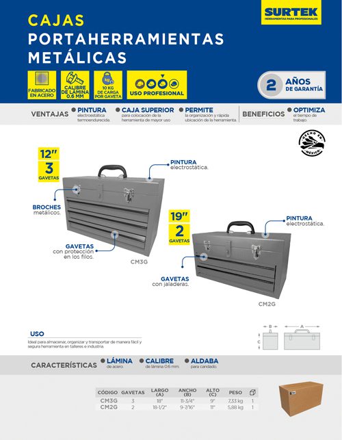 Caja portaherramientas metálica color gris con 3 gavetas 11″ x 18″ x 9″ Surtek