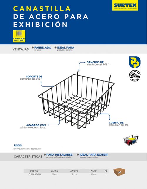 Canastilla para exhibición para panel 31 x 31 x 15 cm Surtek