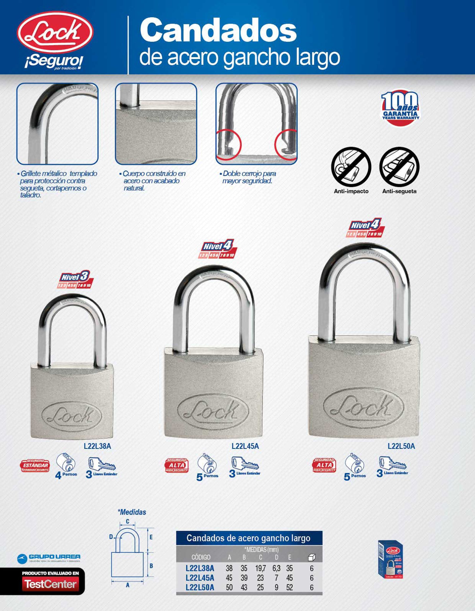 Candado de acero largo 45 mm, llave estándar, en caja Lock
