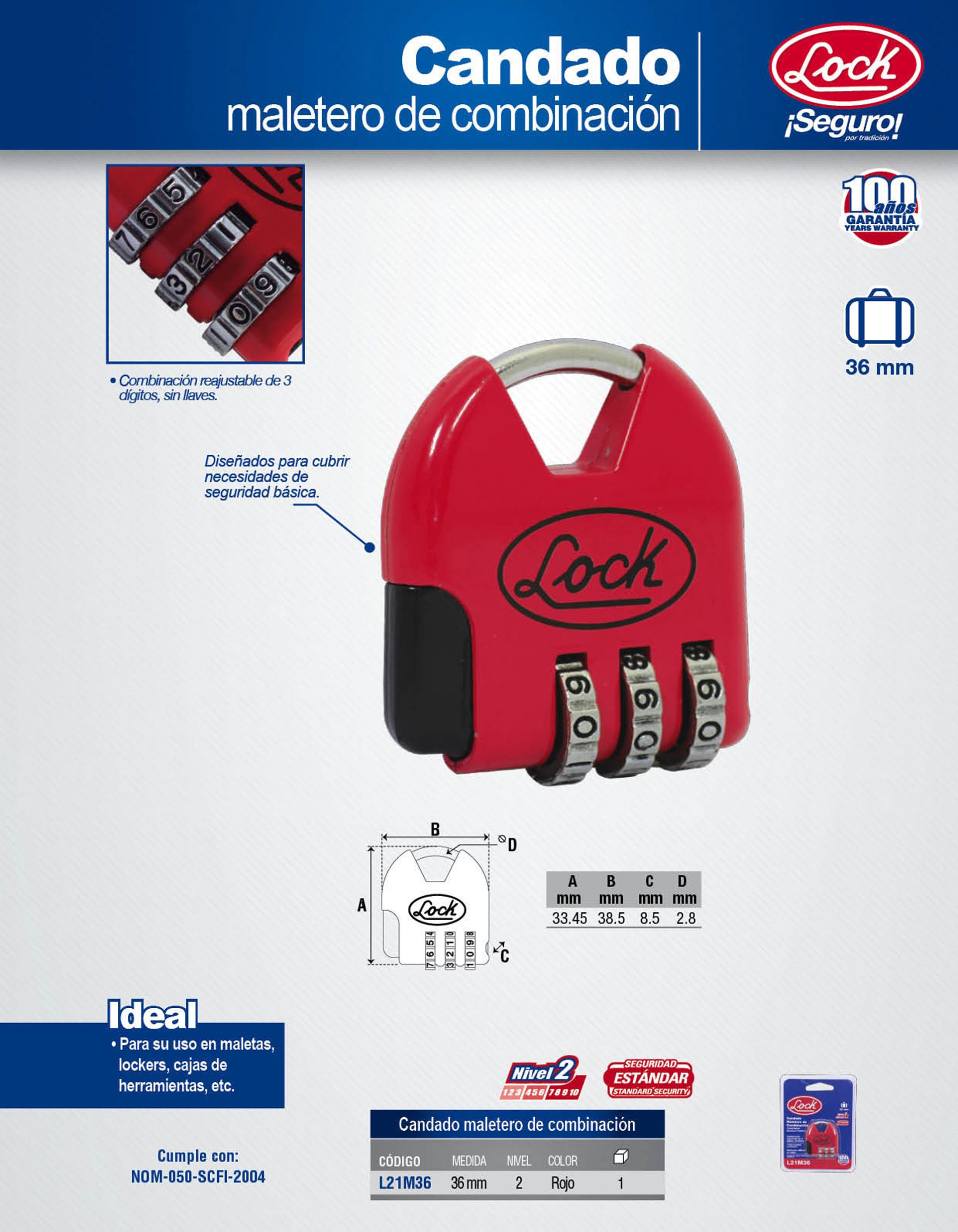 Candado de combinación programable para maleta, rojo, 36 mm Lock