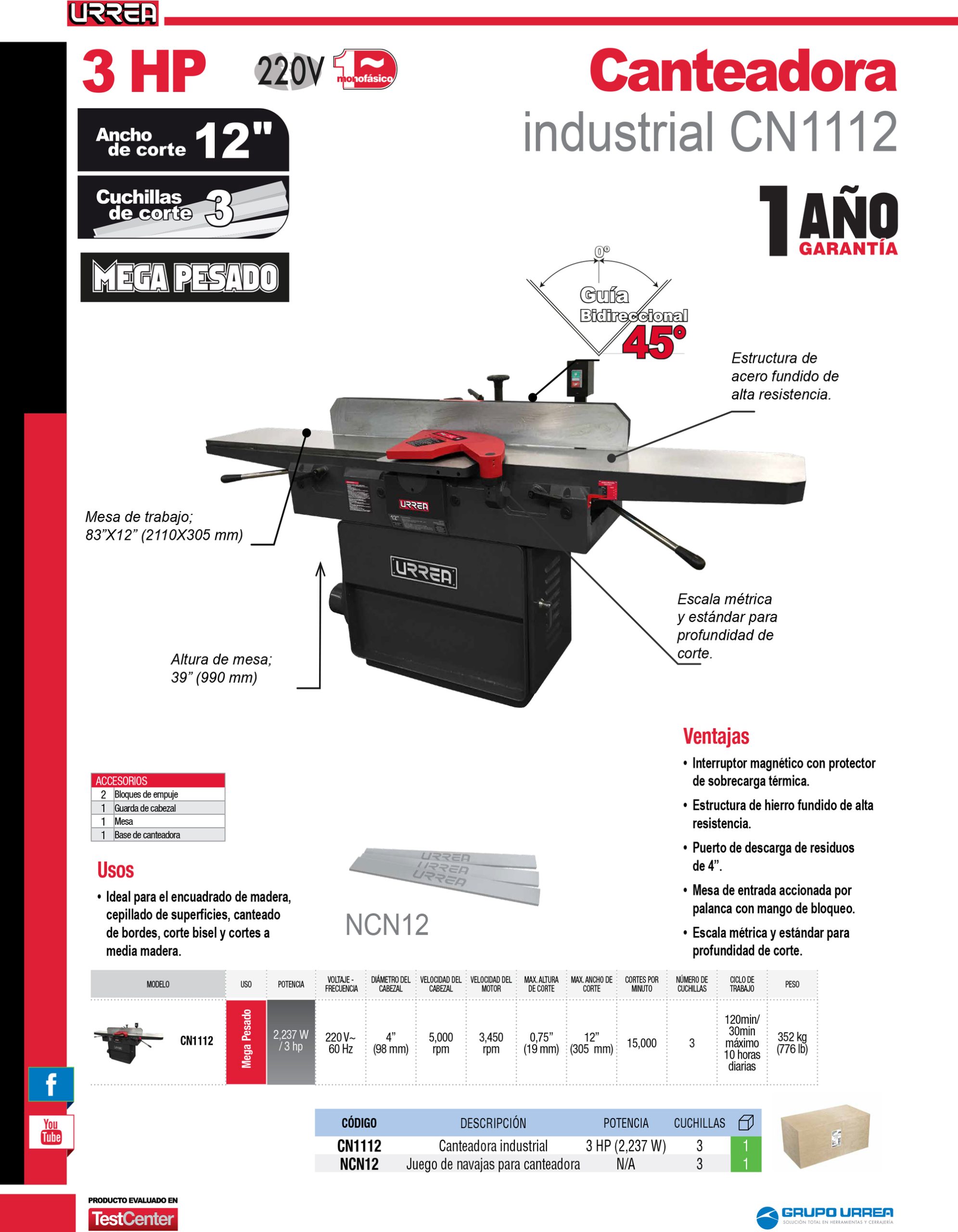 Canteadora 12″ 2,237 W 220 V, 5000 RPM 1 fase Urrea
