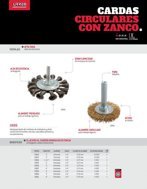 Carda circular ondulada alambre delgado 2″ x 0.30 mm con zanco 1/4″ Urrea