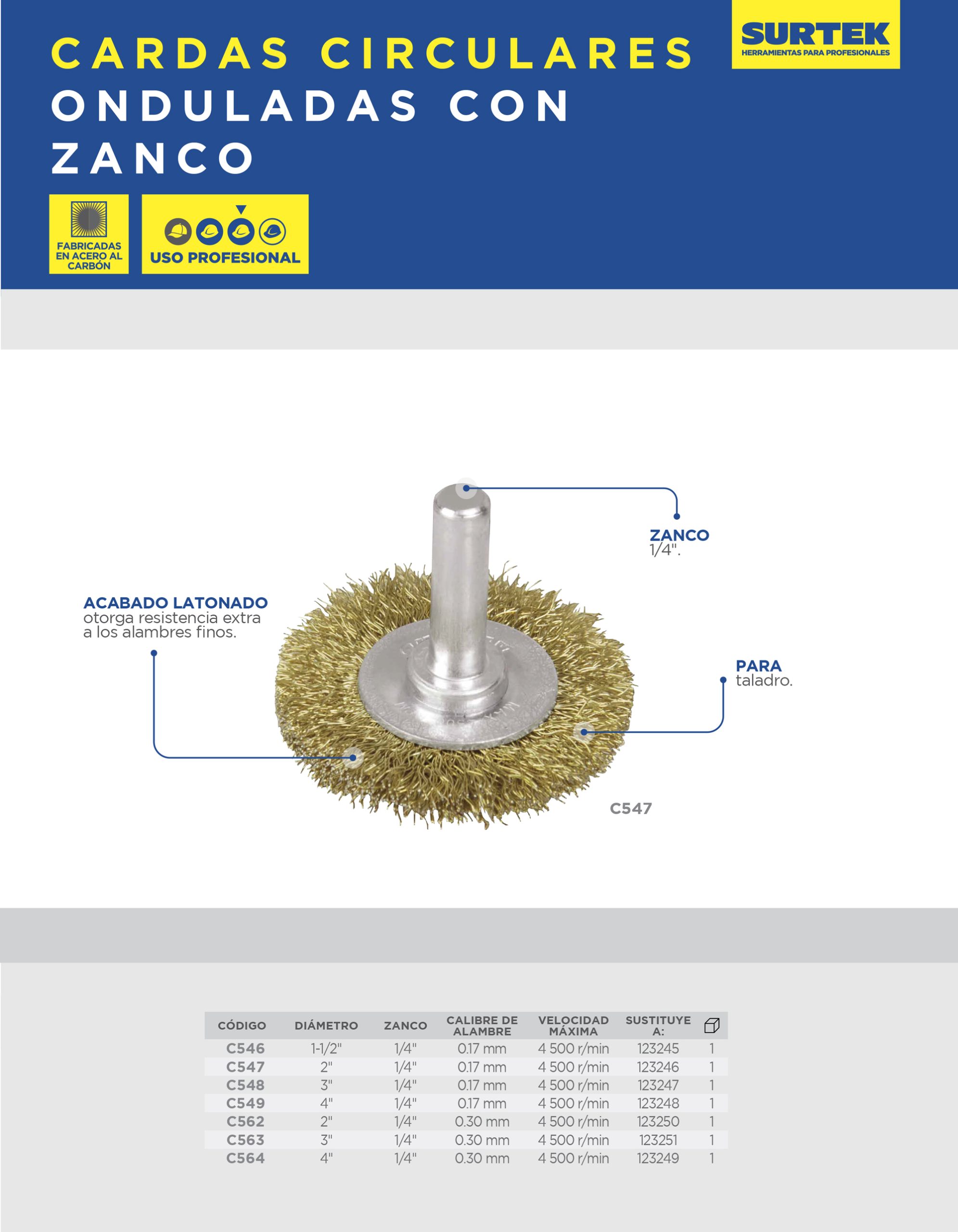 Carda circular ondulada alambre fino 2″ x 0.17 mm con zanco 1/4″ Surtek