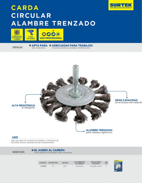 Carda circular trenzada alambre grueso 3″ x 0.50 mm con zanco 1/4″ Surtek