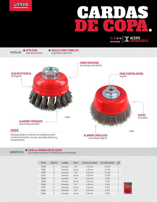 Carda copa ondulada alambre delgado de acero inoxidable 5″ x 0.30 mm con rosca 5/8″ Urrea
