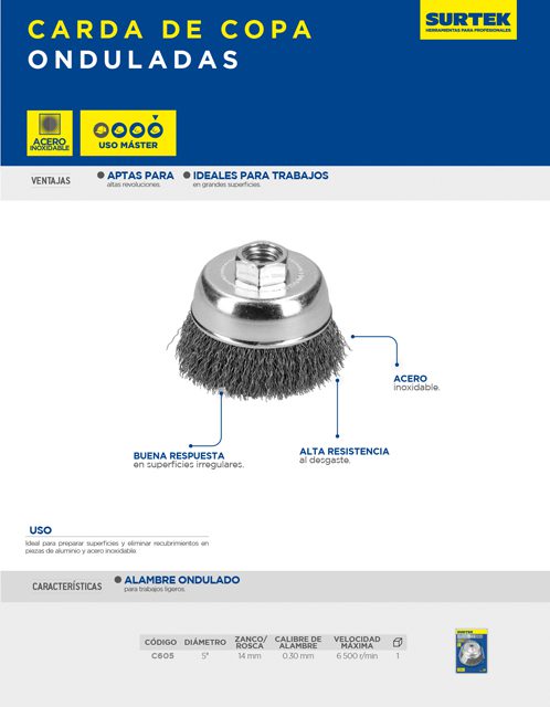 Carda copa trenzada alambre delgado acero inoxidable 5″ x 0.30 mm con rosca M14 Surtek