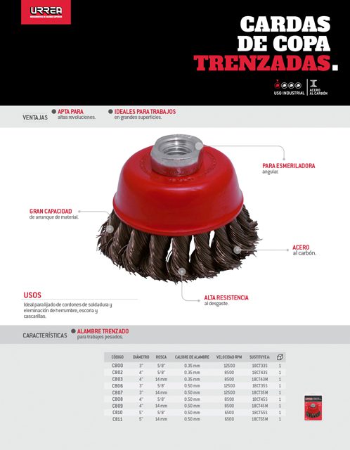 Carda copa trenzada alambre grueso 5″ x 0.50 mm con rosca 5/18″ Urrea