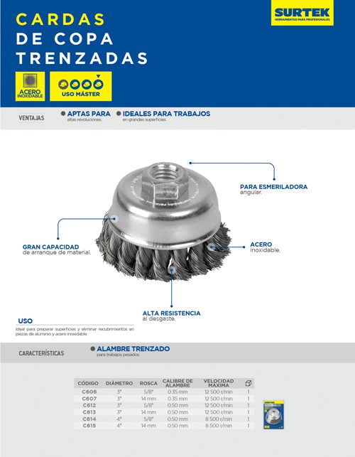 Carda copa trenzada alambre grueso de acero inoxidable 4″ x 0.50 mm con rosca M14 Surtek