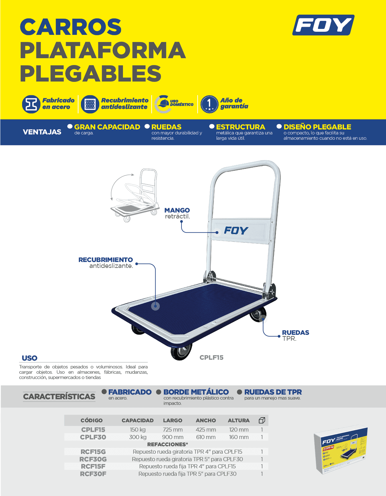 Carro plataforma con maneral retráctil 91 cm x 61 cm, 5″, 300 kg Foy