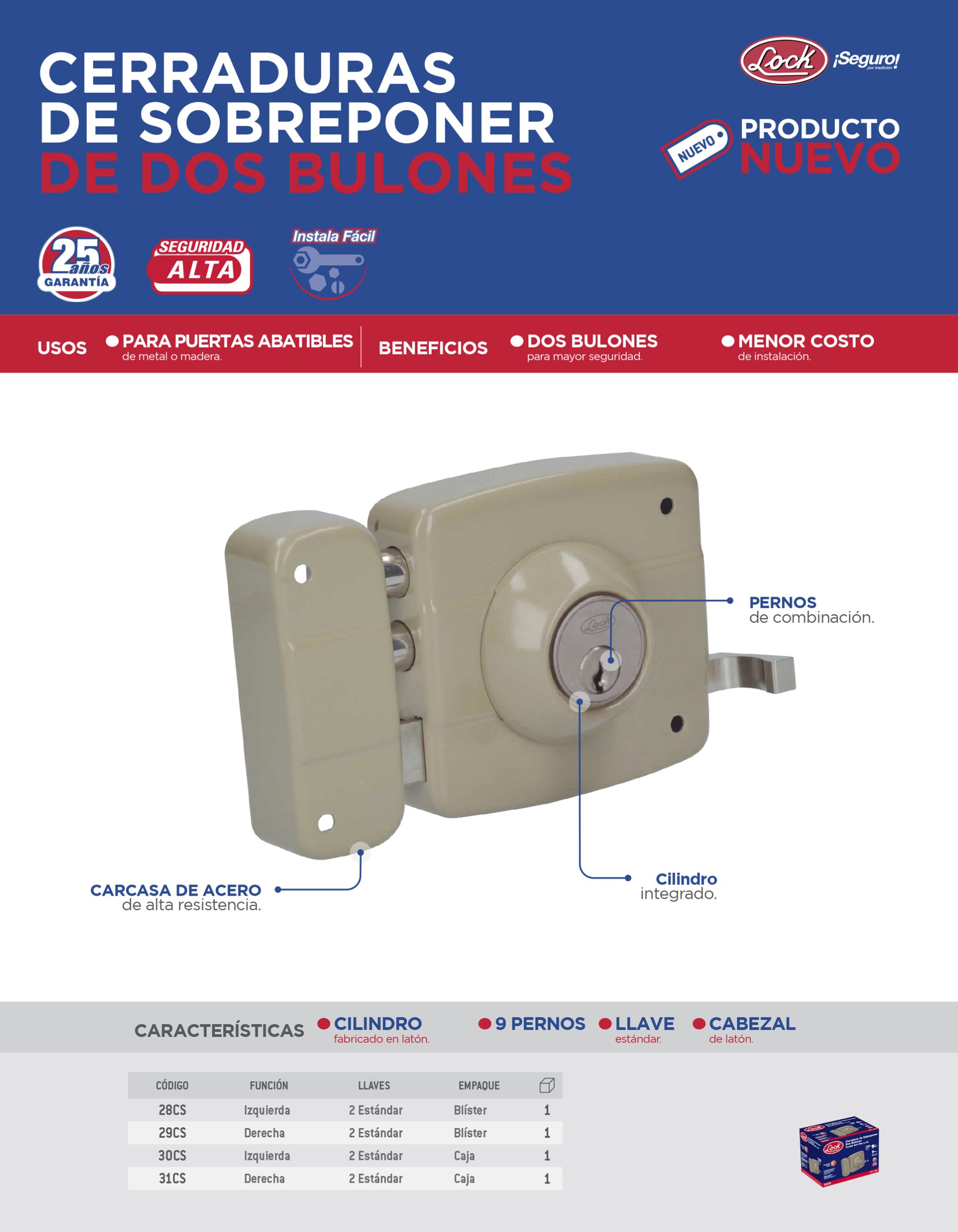 Cerradura de sobreponer función instala fácil, derecha, 2 bulones, llave estándar, blíster Lock