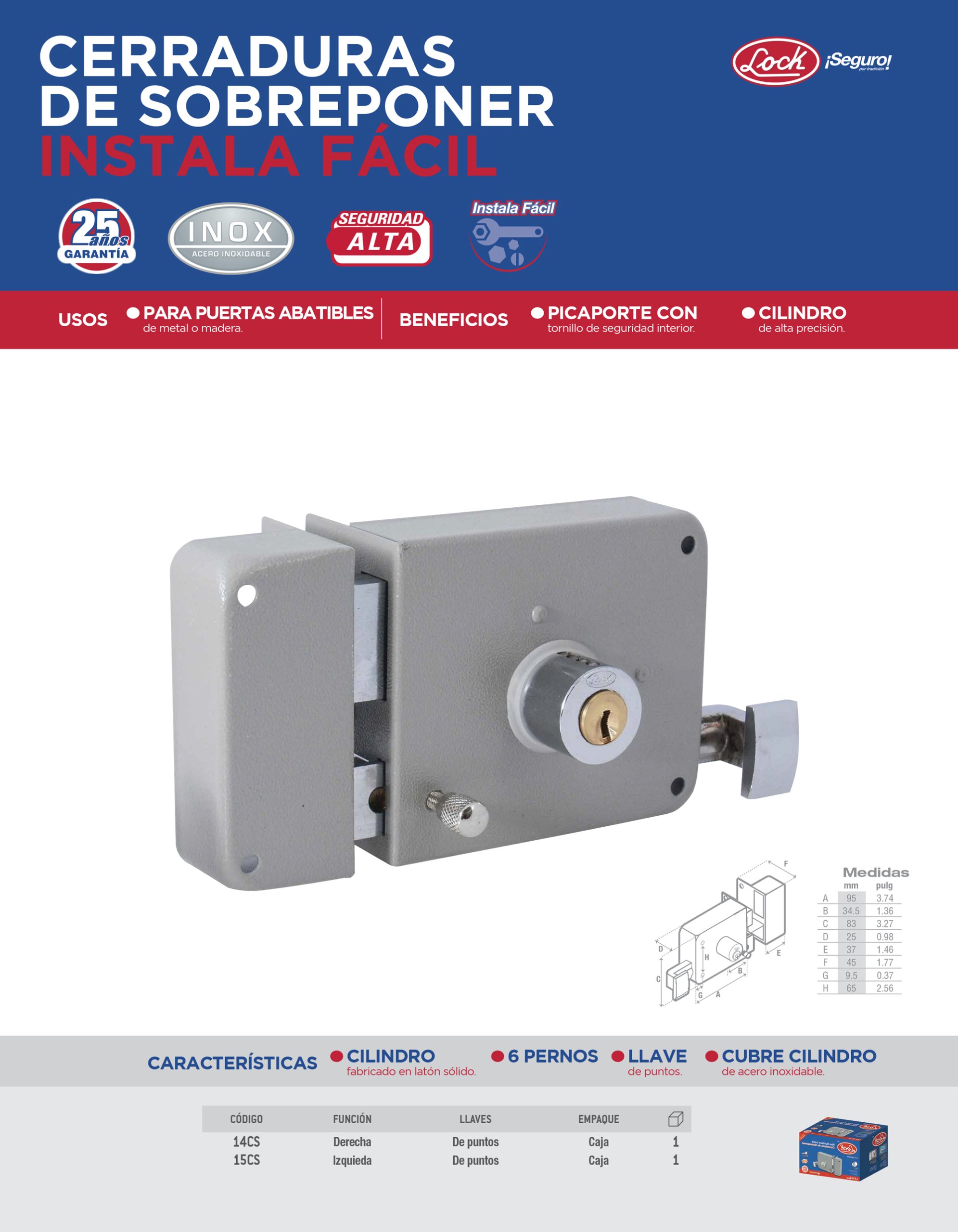 Cerradura de sobreponer función instala fácil, izquierda, llave de puntos, blíster Lock