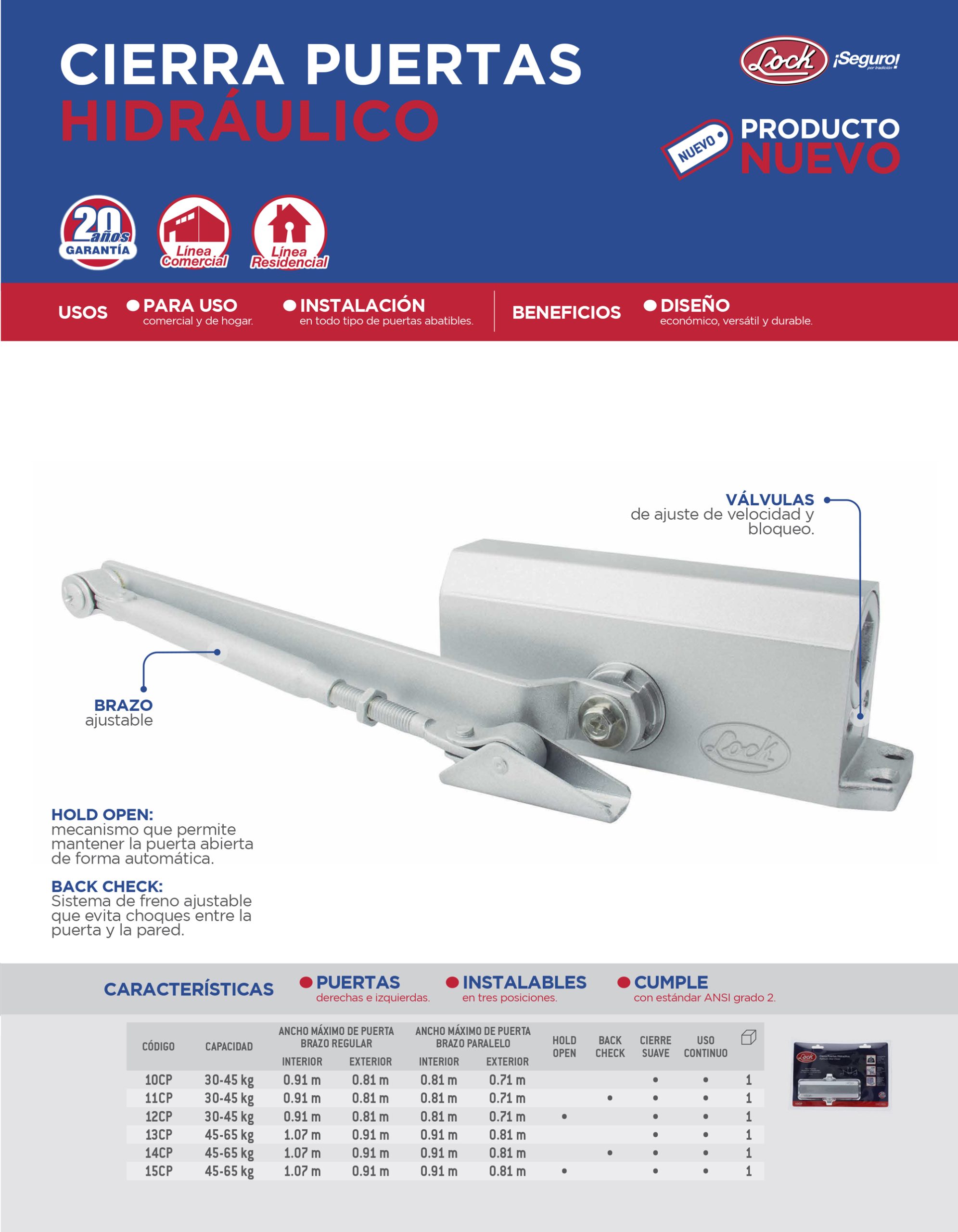 Cierrapuertas hidráulico con capacidad de 30-45 Kg, 180° apertura en espera Lock