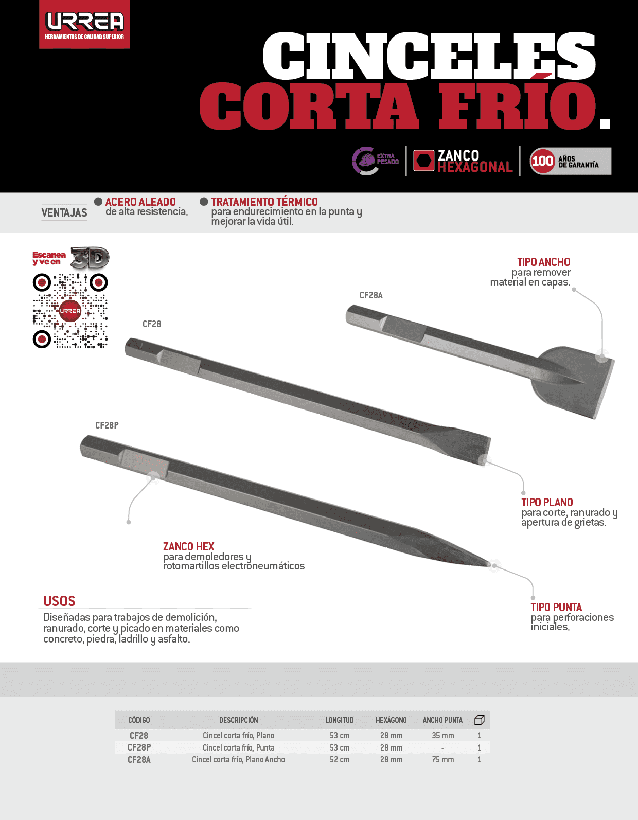 Cincel corta frío para martillos demoledores plano ancho HEX 28 mm x 520 mm Urrea
