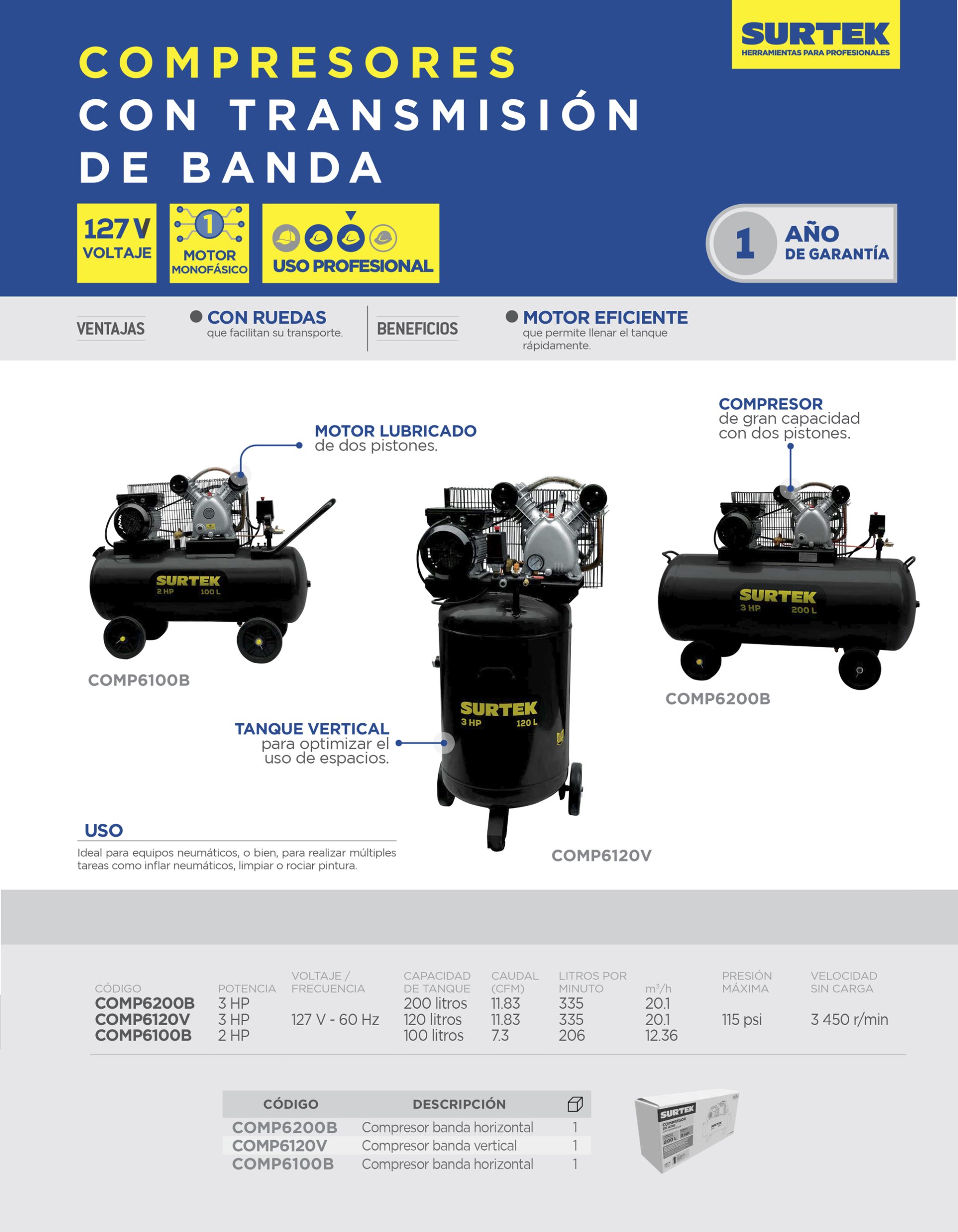 Compresor de aire eléctrico con transmisión de banda vertical 120L, 3HP, 127V Surtek