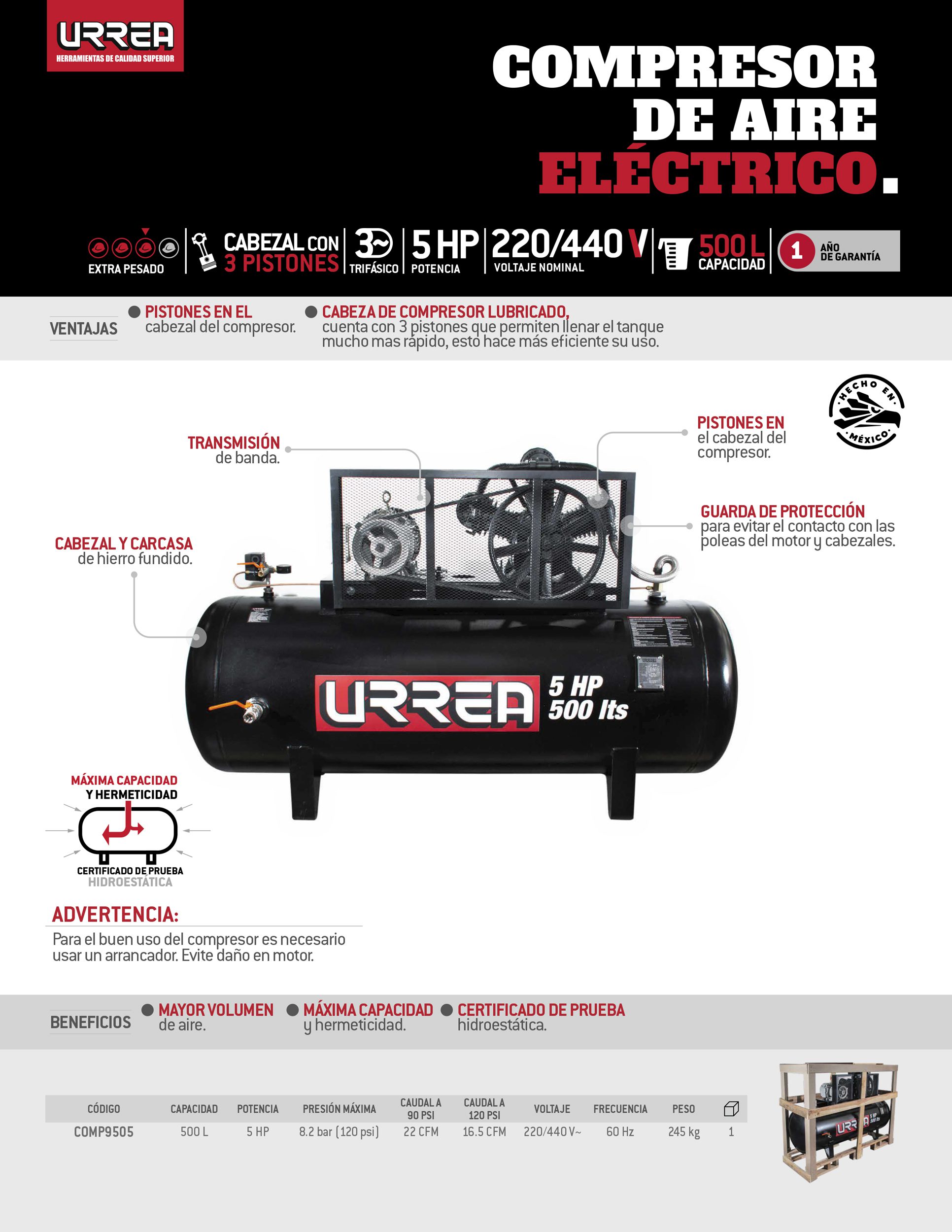 Compresor de aire eléctrico de banda 500L, 5HP, 220V – 440V Urrea