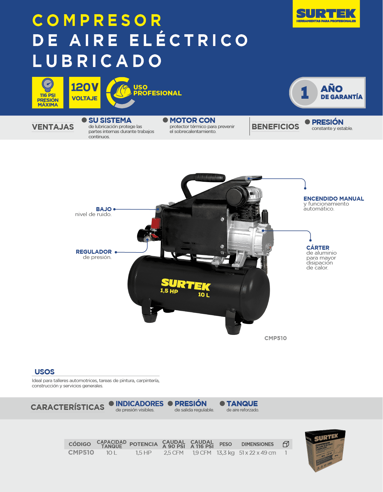 Compresor de aire eléctrico lubricado 10 Lt 1.5 HP, 120 V Surtek