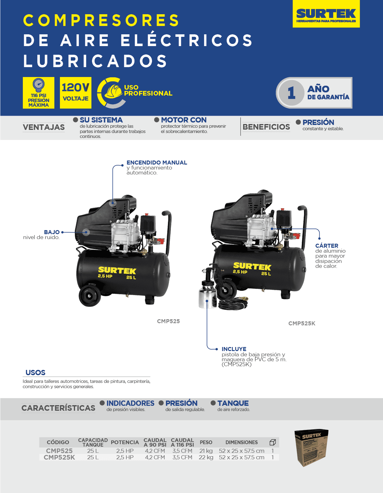 Compresor de aire eléctrico lubricado 25 Lt 2.5 HP, 120 V Surtek