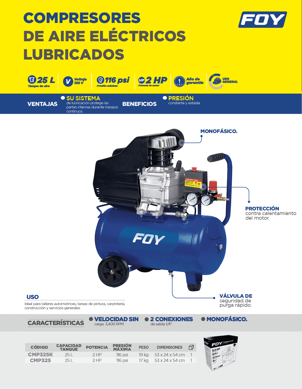 Compresor de aire eléctrico lubricado 25 Lt 2 HP 120 V Foy