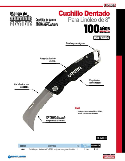 Cuchillo de acero inoxidable con mango acero de 8″, para linóleo Urrea