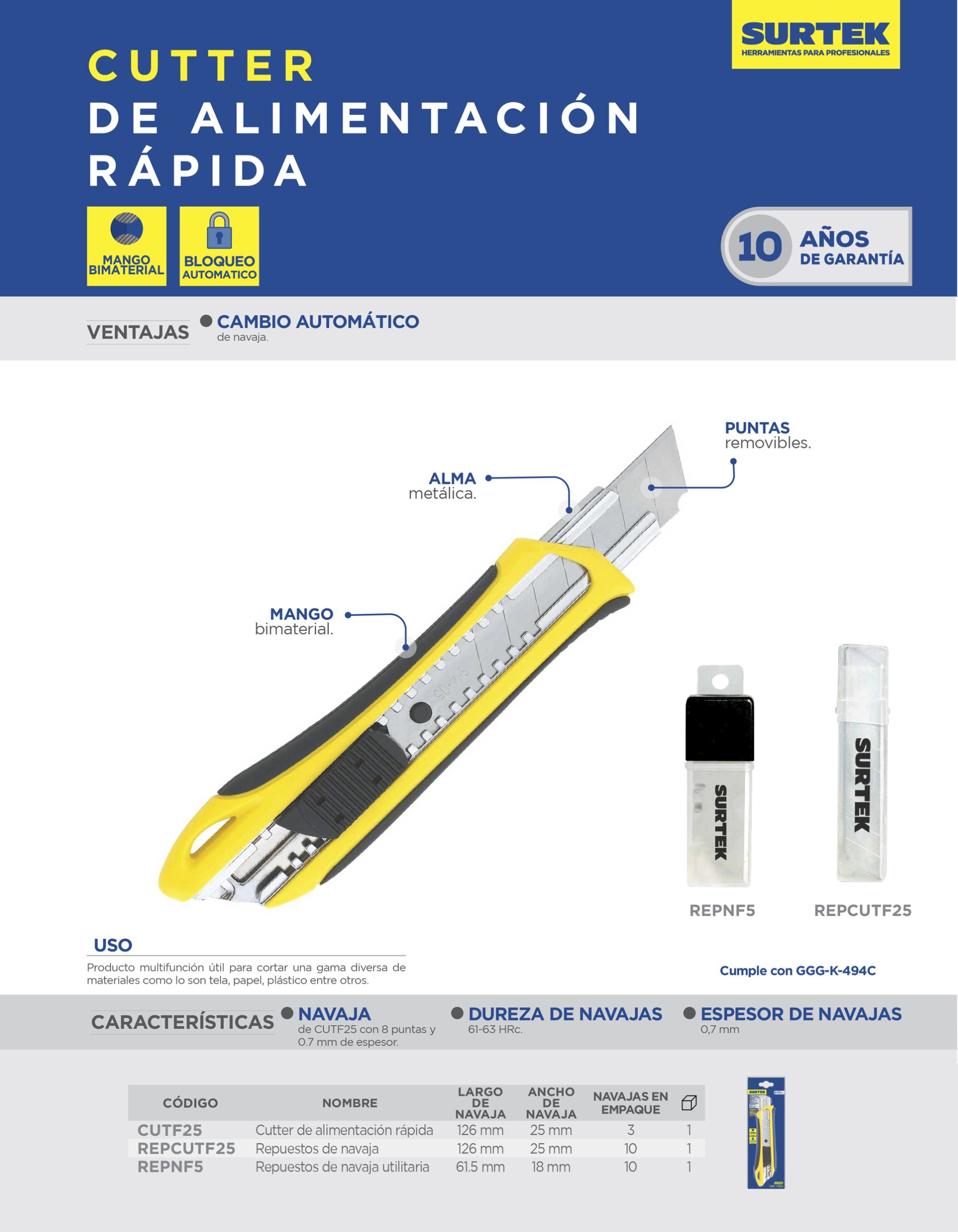 Cutter con cuerpo de plástico de 25 mm, cambio automático de navaja Surtek