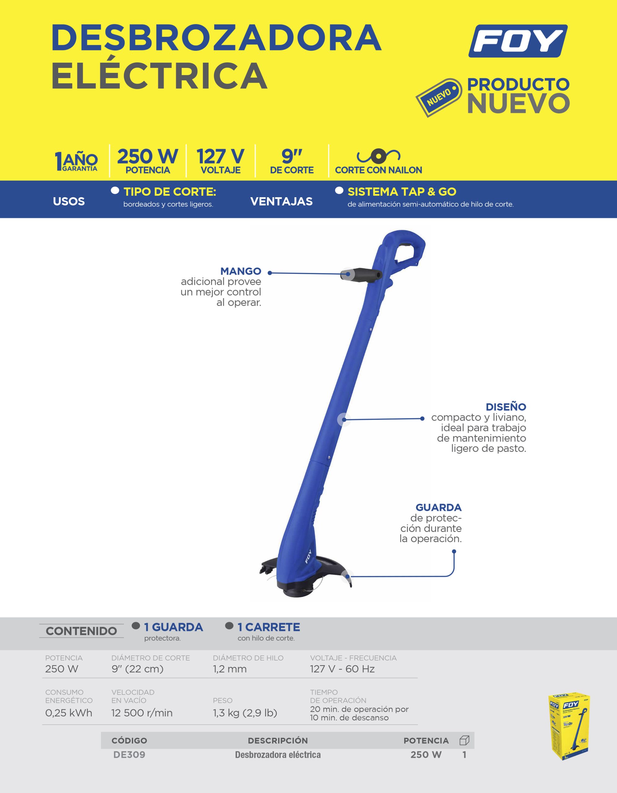 -Desbrozadora eléctrica FOY de 9” para cortes ligeros y bordeados, un mango adicional para mejor control, incluye guarda protectora.