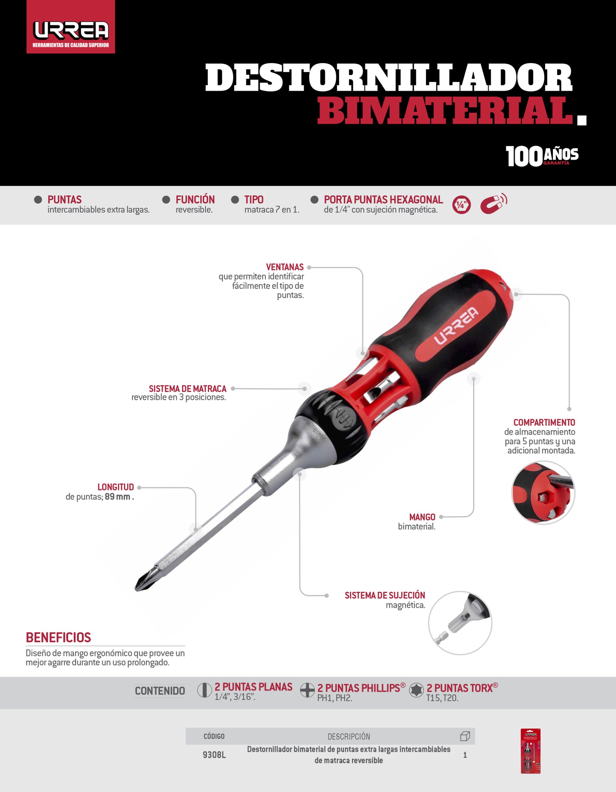 Destornillador con mango bimaterial de matraca con puntas largas intercambiables 7 en 1 Urrea