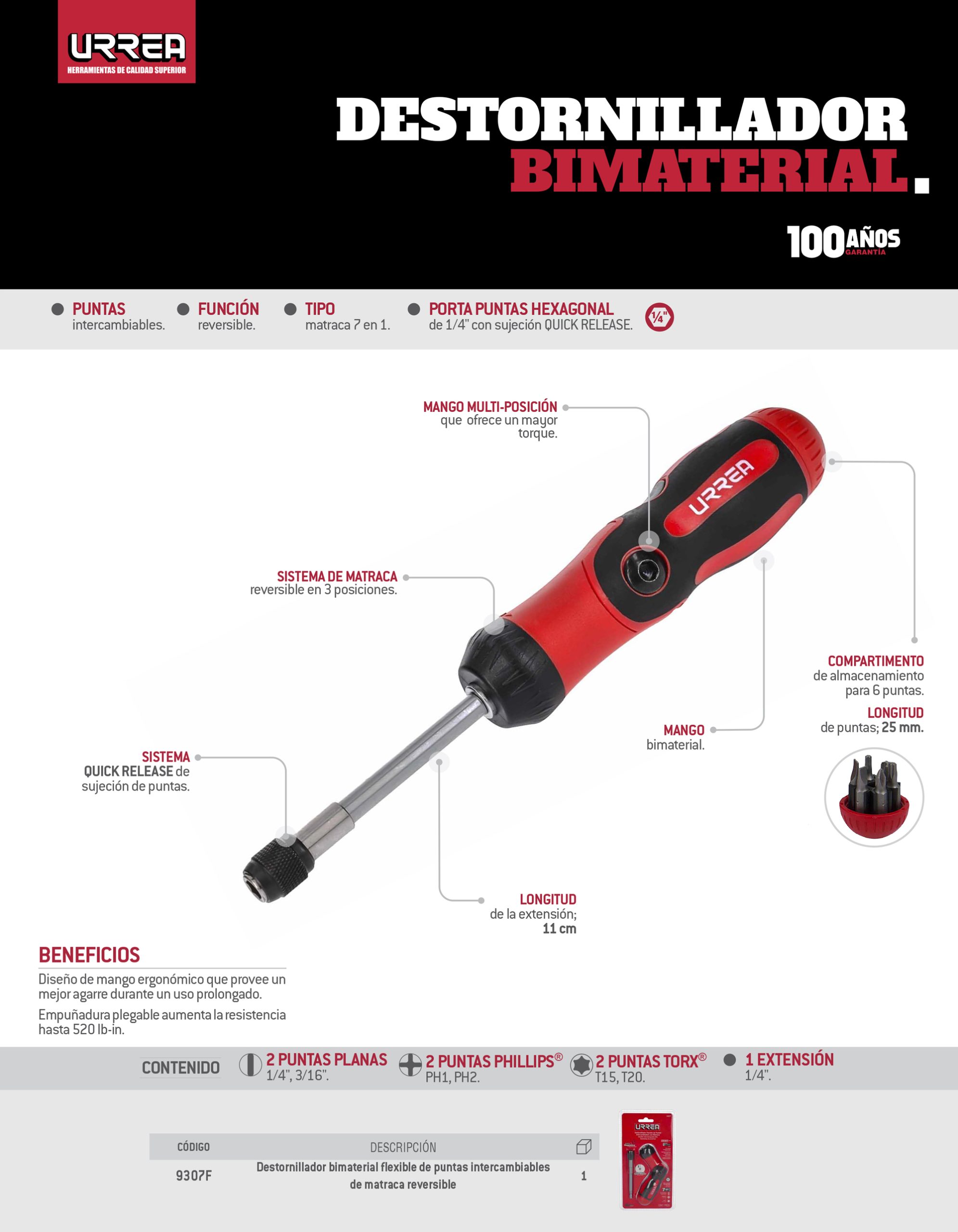 Destornillador con mango bimaterial de matraca flexible con puntas intercambiables 7 en 1 Urrea