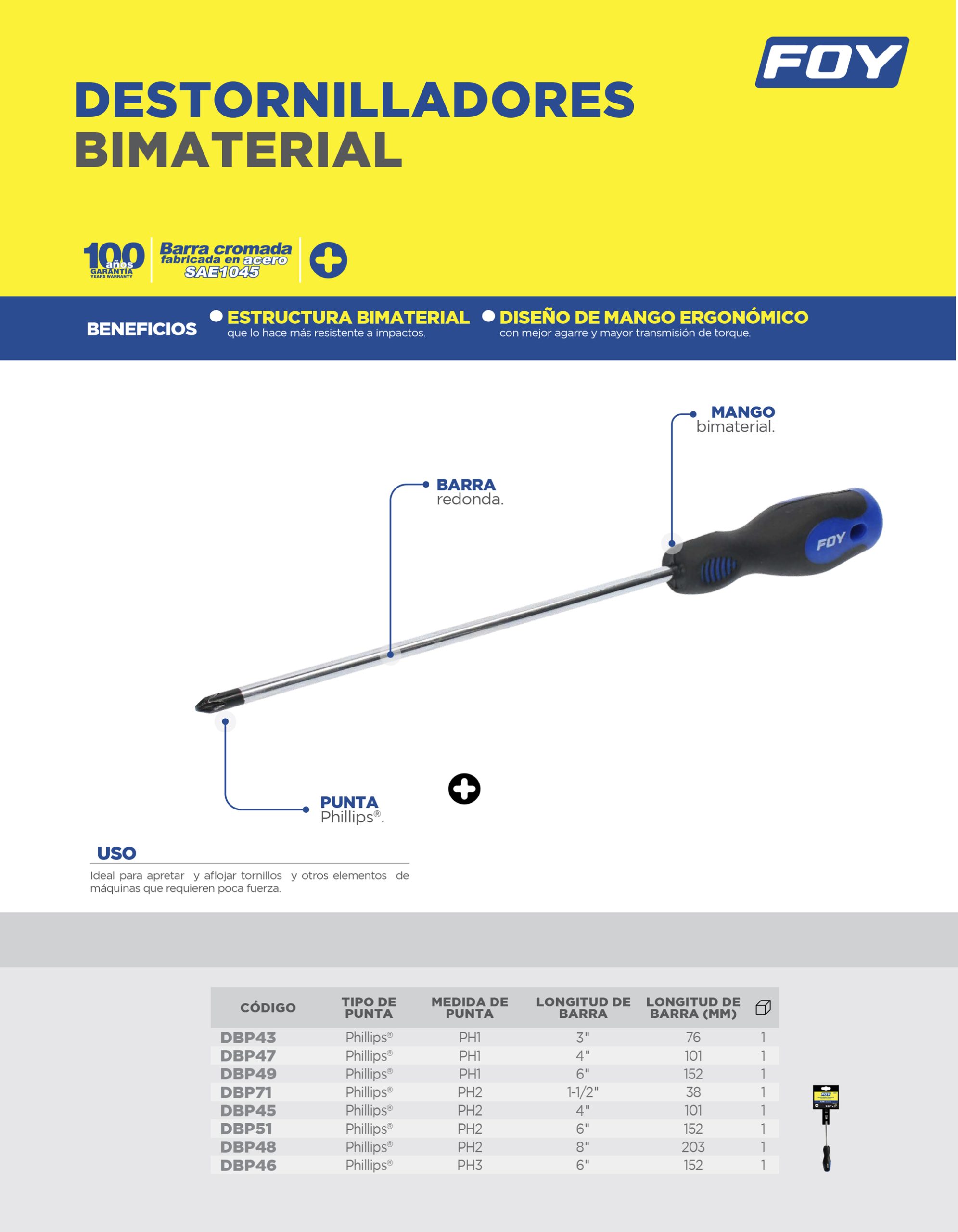 Destornillador con mango bimaterial, punta Phillips #1 x 3″ Foy
