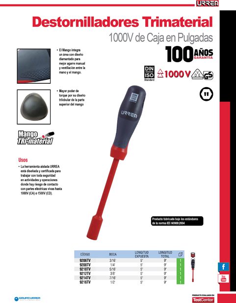 Destornillador con mango trimaterial 1000 V, de caja en pulgadas 3/16″ x 5″ Urrea