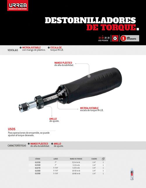 Destornillador de torque microajustable con mango plástico cuadro de 1/4″, 10-90 in-lb Urrea