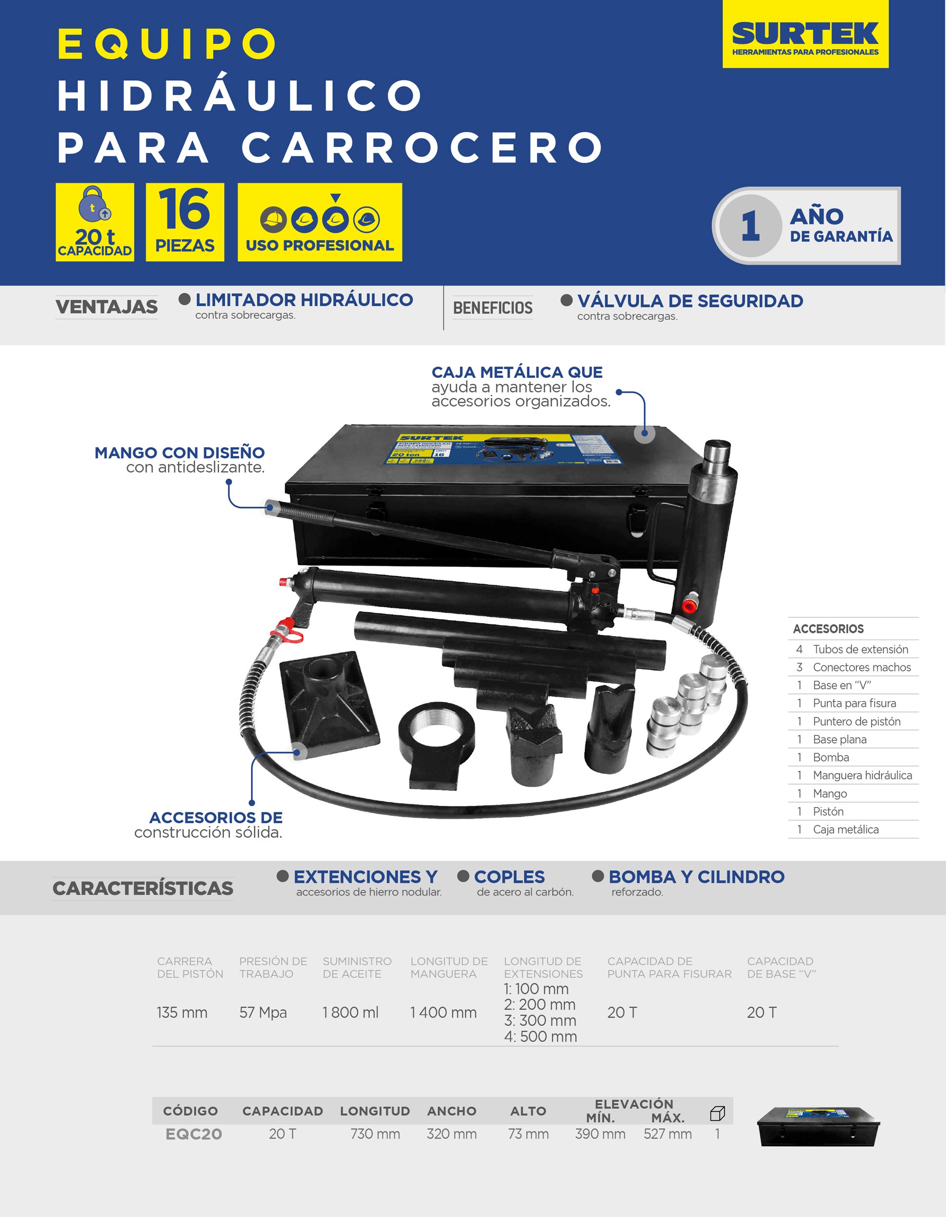 Equipo hidráulico para carrocero 20 toneladas, 16 piezas Surtek