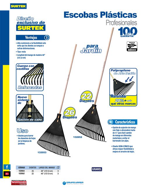 -Tipo recta. 22 dientes. Fabricada en polipropileno de alta flexibilidad. Cuerpo con venos de refuerzo para mayor resistencia. Mango de madera de 48″. Espesor de zona de dientes: 5mm.