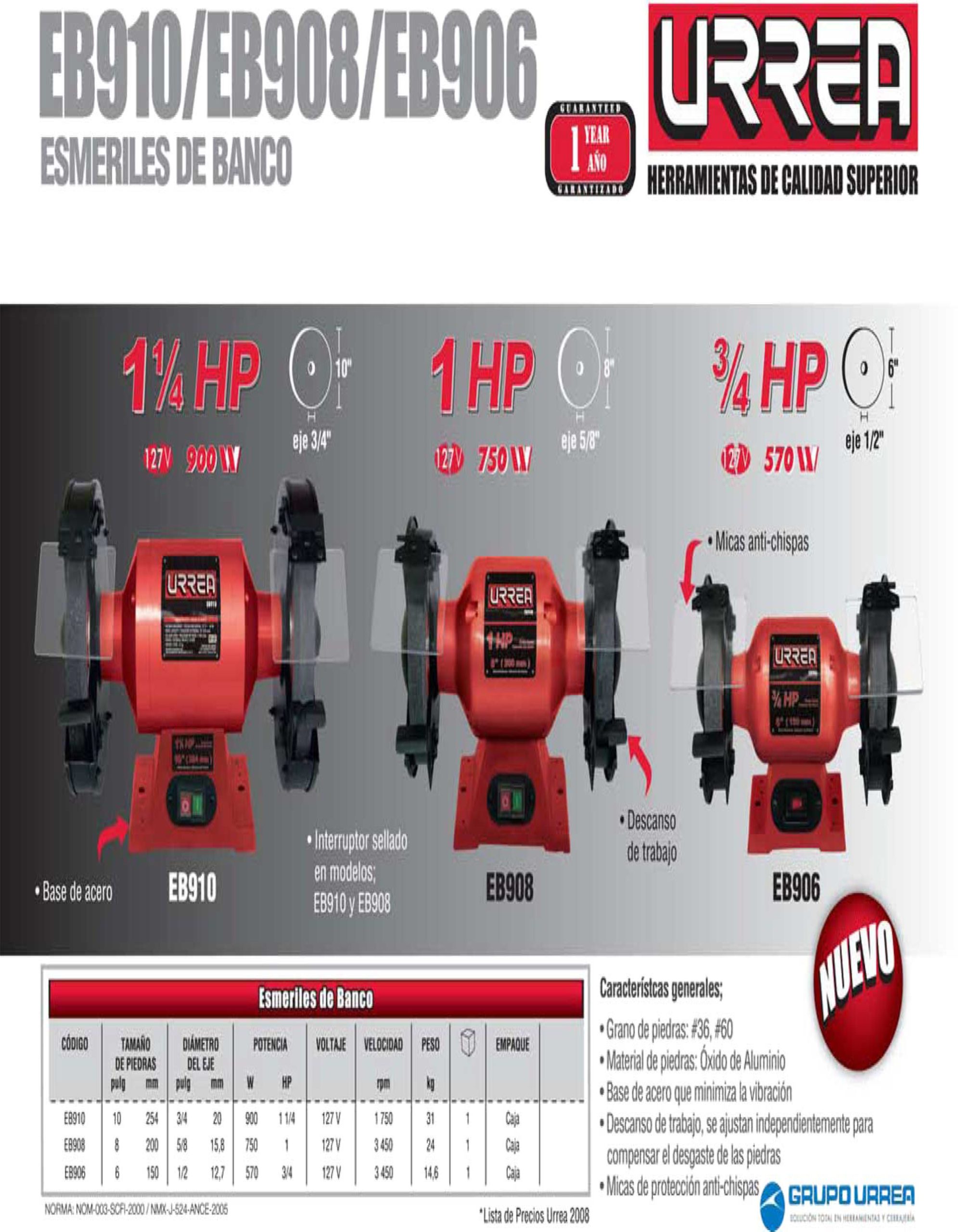 Esmeril de banco 6″ 3/4 HP 570 W 127 V, 3450 RPM Urrea