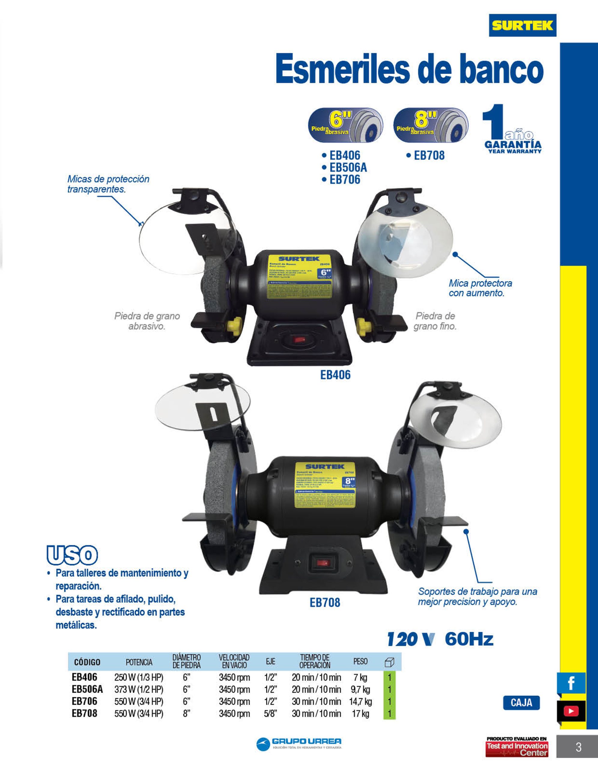 Esmeril de banco motor silencioso de inducción 6″ 1/2 HP 343 W 120 V, 3450 RPM Surtek